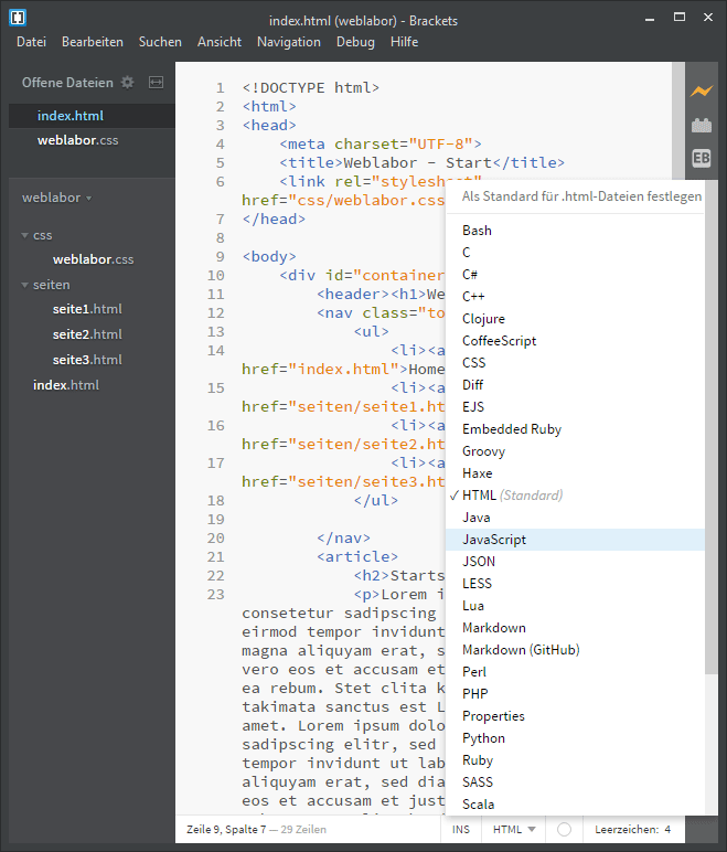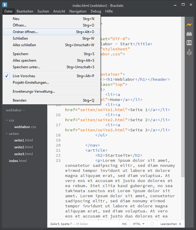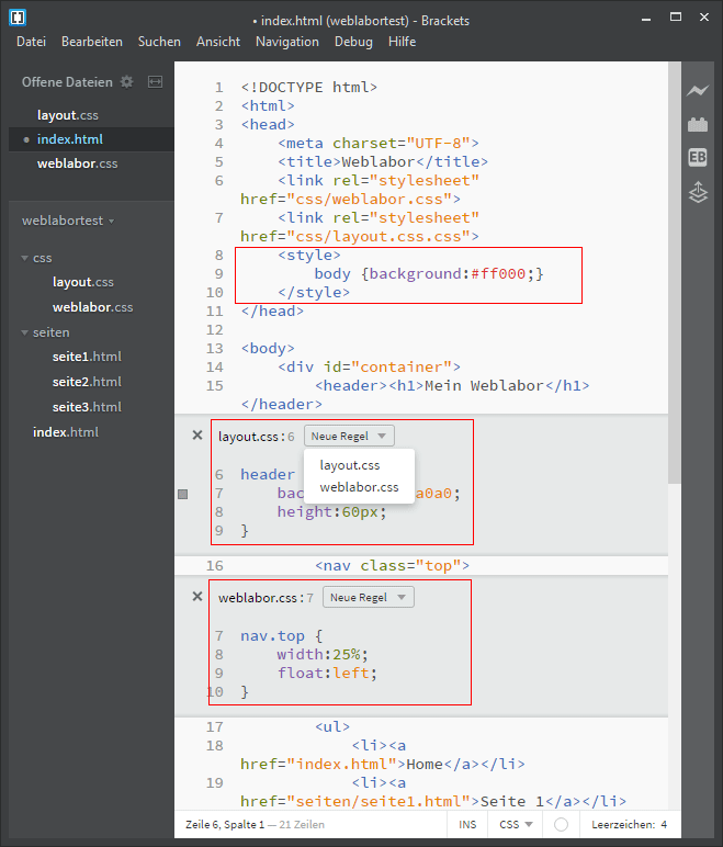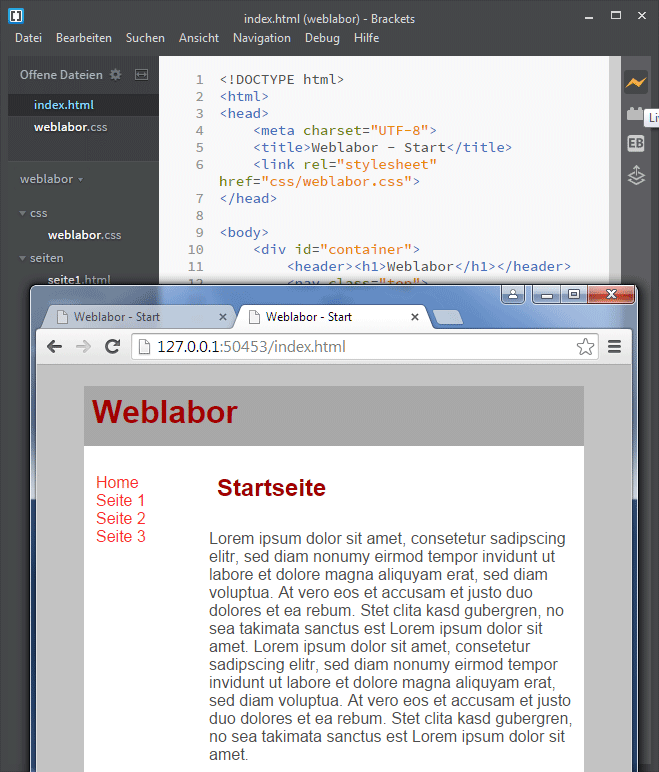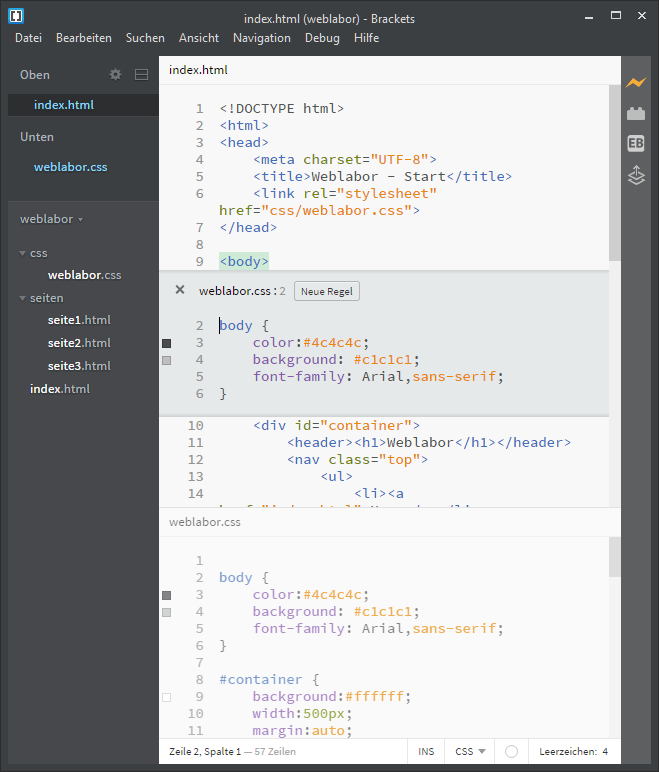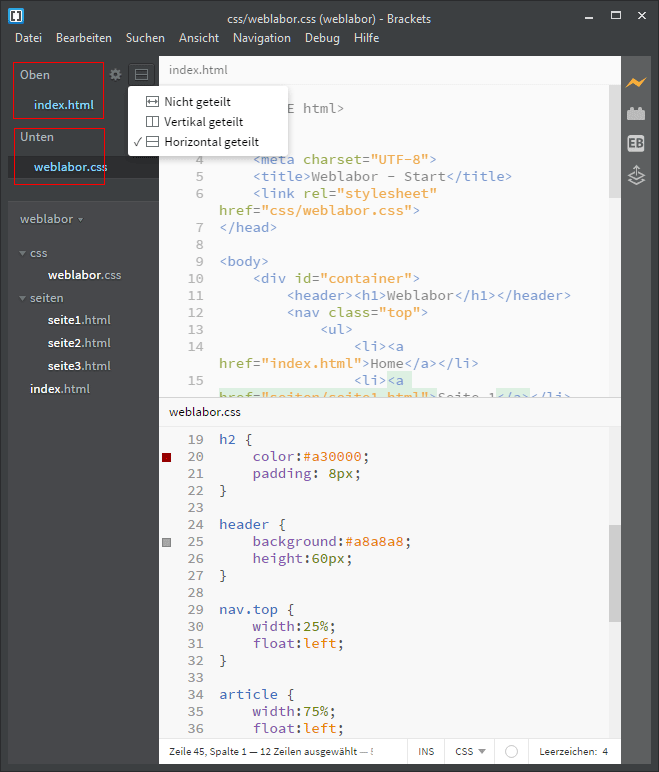 Das Editorfenster lässt sich teilen, so können zwei Dateien gleichzeitig betrachtet oder bearbeitet werden. Im angebildeten Screenshot wurde die Html-Datei und die verlinkte CSS-Datei angezeigt.