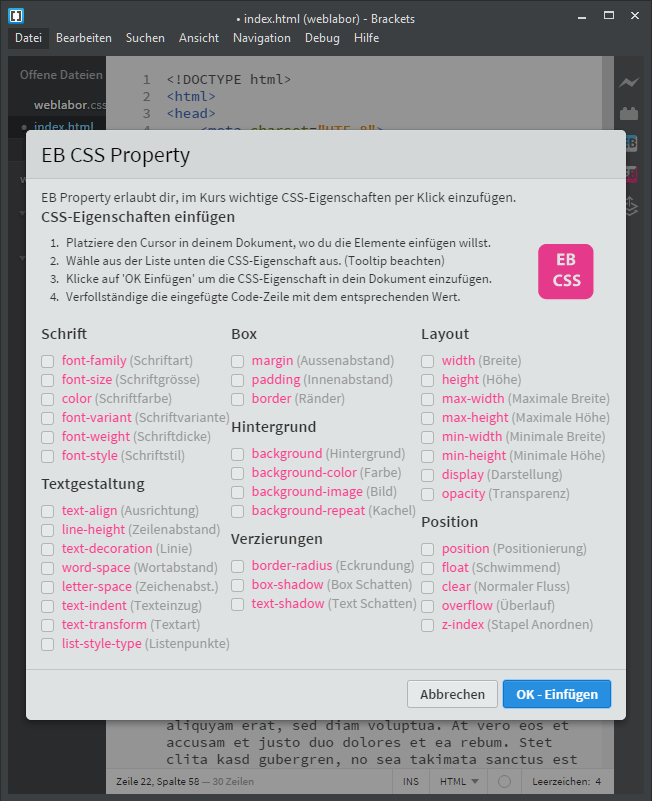 Dabei wird innerhalb der HTML-Datei, unter dem gewählten HTML-Element ein CSS-Fenster eingeblendet. Die Übersicht bleibt dabei sehr gut erhalten.