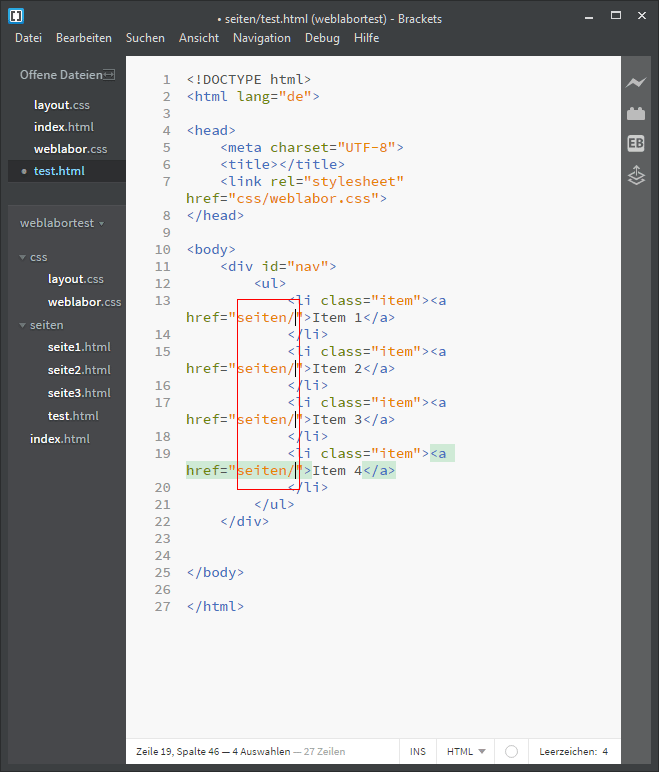 Mit AltGR+Klick (AltGr+ziehen) kann der Cursor an viele Stellen gleichzeitig gesetzt werden. Dies ist eine schnelle Zugriffsmöglichkeit wenn bspw. Pafadangaben in einer Navigationsliste angepasst werden müssen. Meist beim Programmieren (PHP oder JS) verwendet, kann es auch im HTML hilfreich sein.